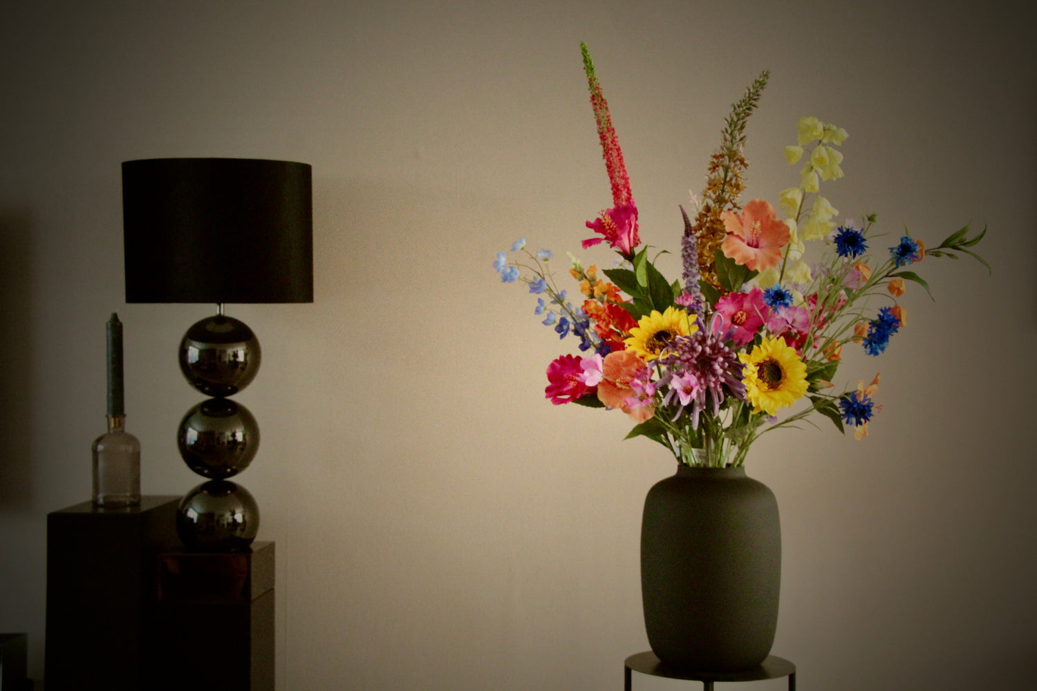 Creëer hier je eigen boeket. Stel dit zelf samen door bovenstaande opties. Stuur na het bevestigen van de bestelling een email met daarin je specifieke wensen, welke vaas je het boeket wilt, of de maten van de vaas (indien je deze zelf al hebt) zodat wij jouw specifieke zijdeboeket kunnen opmaken.